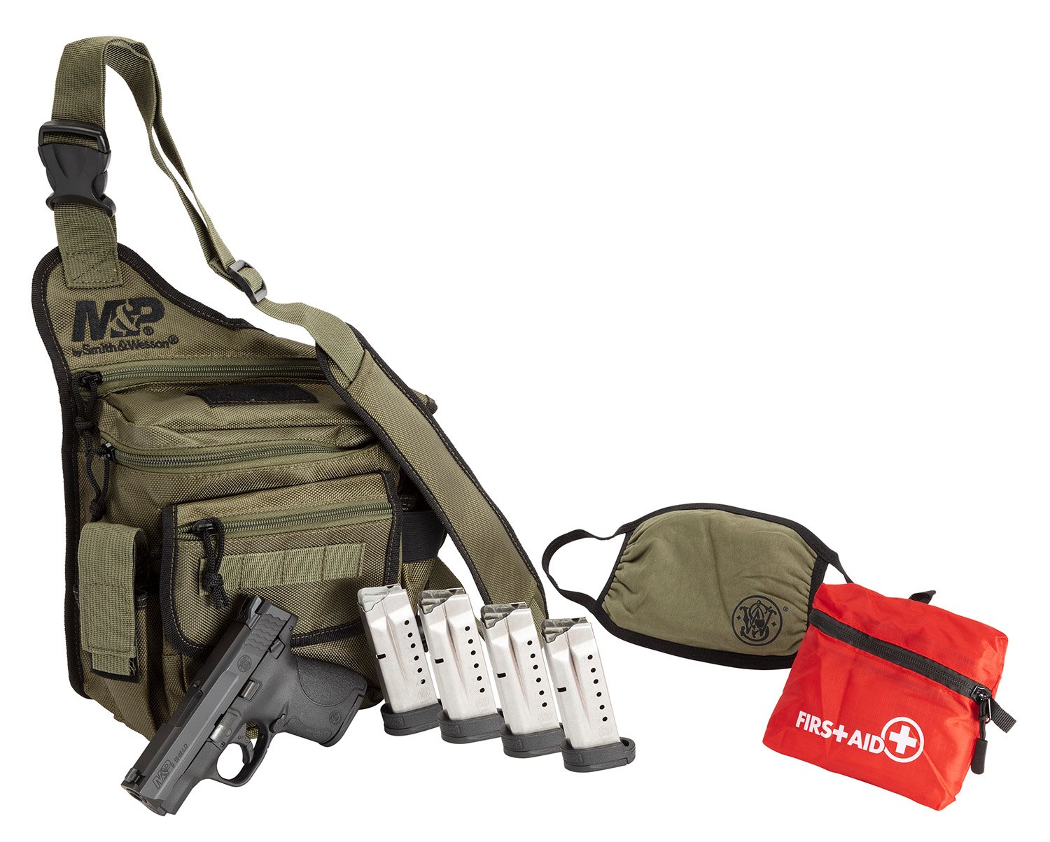 This Bug Out Bag Bundle comes with a M&P9 Shield Pistol, M&P branded Bug Out Bag, five magazines (4-8 round, 1-7 round), M&P branded face mask, and a first aid kit.