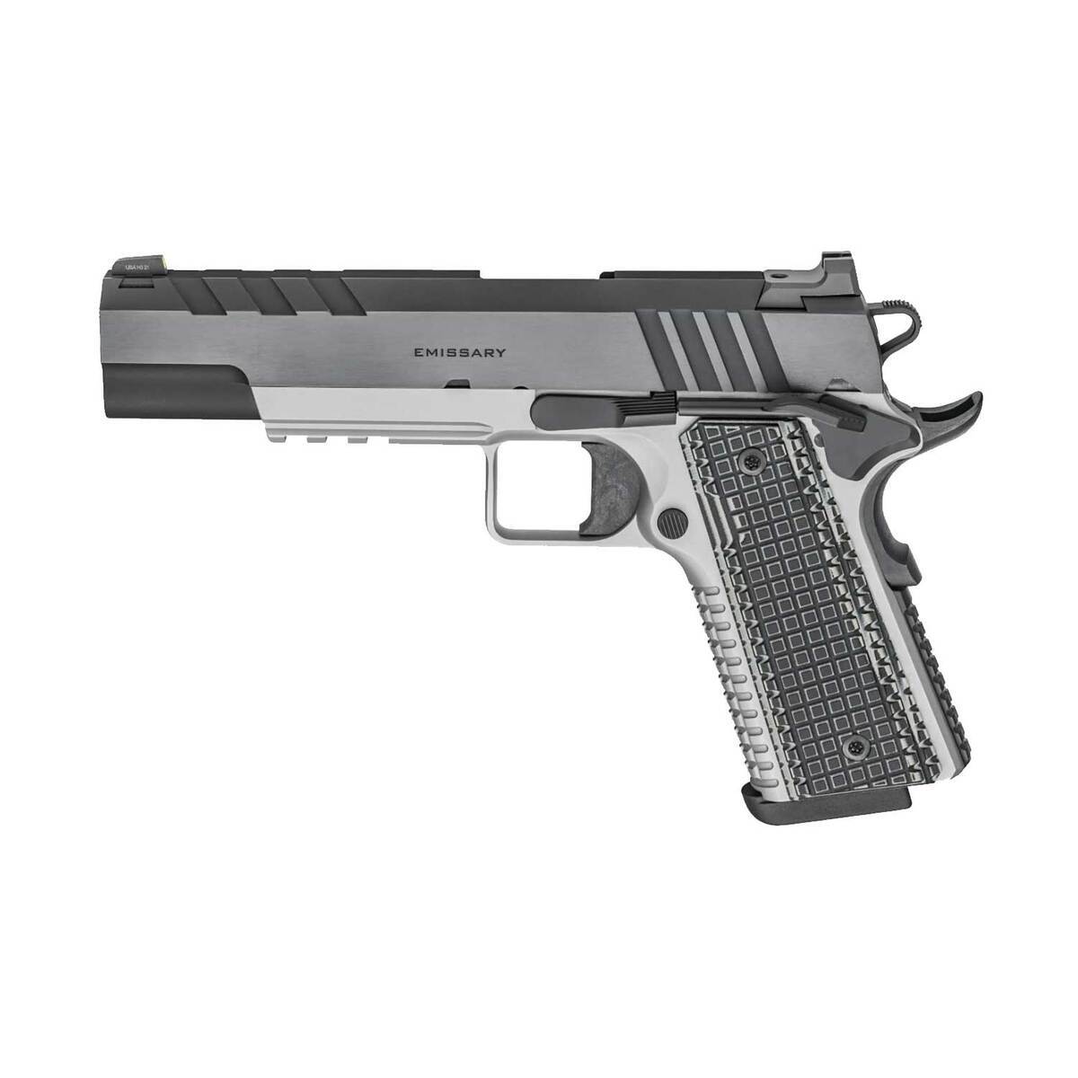 Springfield Armory 1911 Emissary 9mm 5in Stainless Pistol – 9+1 Rounds – For those who want a pistol that combines cutting-edge defensive features with custom upgrades, the Emissary 5in 9mm is a serious user’s pistol. With a Tri-Top slide featuring light-diffusing 40 line-per-inch serrations along the sighting plane and a heavy-profile forged stainless steel bull barrel, the 9mm Emissary delivers maximum accuracy. A forged hot salt blued slide and forged stainless steel frame with squared triggerguard and grenade-pattern checkering gives you a pistol ready for display or defense.