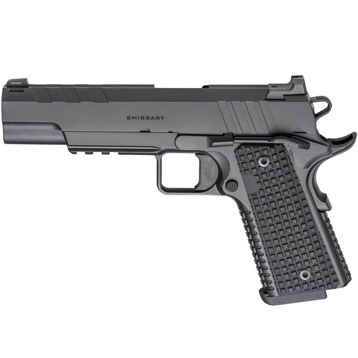 Springfield Armory 1911 Emissary 9mm Luger 5in Black Cerakote Pistol – 9+1 Rounds – The all-black Emissary in 9mm features a Cerakote finish that combines with custom 1911-style features and enhancements to offer a serious defensive pistol. The 5in-barreled pistol has a “Tri-Top” cut to the slide with light diffusing 40 LPI flat-top serrations, and the heavy-profile bull barrel delivers maximum accuracy and reduced muzzle flip. With a forged slide and frame for strength and durability, the Emissary blends form and function seamlessly in a defensive-minded firearm loaded with custom-grade features.
