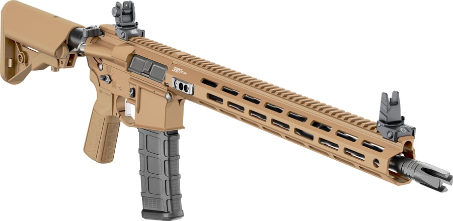 Engineered for durability and performance, the SAINT® Victor 5.56 delivers purpose-driven features in a lightweight, rugged package. Forged 7075-T6 receivers finished in Coyote Brown Cerakote® offer exceptional strength without added weight, while the continuous tapered barrel enhances heat distribution and rigidity. A 9310 enhanced bolt carrier group and pinned gas block work together to ensure consistent, repeatable cycling. The flat-faced, nickel boron-coated trigger offers a smooth, responsive pull for confident shot control. Up front, the free-floated handguard features a full-length top rail and ample M-Lok® real estate, ready for lights, grips, and other accessories. With seven integrated QD cups and spring-loaded aluminum flip-up sights included, the Victor is built to run right out of the box.