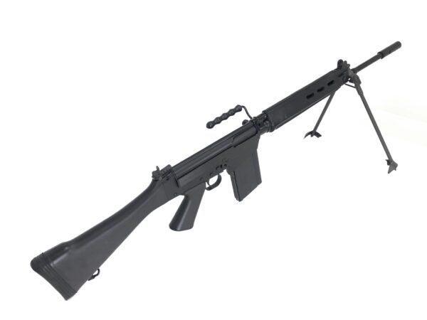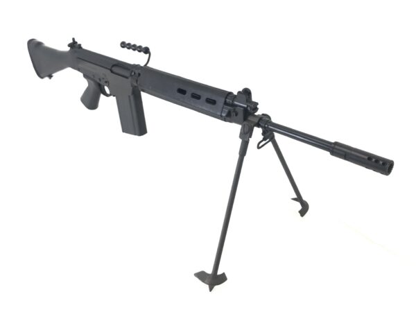 Built by Springfield Armory, Inc. in Geneseo, IL, the SAR-48 is a direct, US-made copy of the venerable FN FAL assault rifle. Known as the “right arm of the free world” based on it’s widely accepted military use by NATO countries, this FAL copy was built by Springfield using the original metric design. This model is a full size rifle version, and features a fixed stock and a 21″ barrel. The fire selector controls are marked “S”, “F”, and “A” in white and red letter for safe and fire, respectively. This model will also come with its original Springfield Armory manual, as well as an original olive drab sling and original FAL bayonet with scabbard.