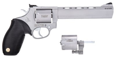 The Taurus 692 delivers a versatile and reliable revolver design with excellent performance and accuracy. It comes with cylinders for .357 Mag and 9mm with a 6.5 inch barrel. Features include a rubber grip, moon clips, and a 7 round capacity. Get the best revolver deals online from GrabAGun today!692 Features The Taurus 692 revolver offers the ability to change the caliber from 38 Special +P/357 Magnum, to 9mm Luger with a simple swap of the cylinder. The ported barrel manages recoil for quicker target re-acquisition. The 692 revolver has fixed front/adjustable rear sights, spurred hammer and Taurus’ Ribber Grip and a transfer bar safety. Includes Stellar clips. 692 Specifications Model: 692 Action: SA / DA Frame Size: Medium Sights: Fixed Front, Adjustable Rear Capacity: 7rd Cylinder Finish: Matte Stainless Frame Description: Matte Stainless Steel Grips: Black Ribber Hammer Style: Exposed Includes: Moon Clips / Cylinder Max Capacity: 7 OAL: 11.64″ Safety: Transfer Bar Weight: 46 oz Barrel Description: Stainless Steel Barrel Finish: Matte Stainless Barrel Length: 6.50″