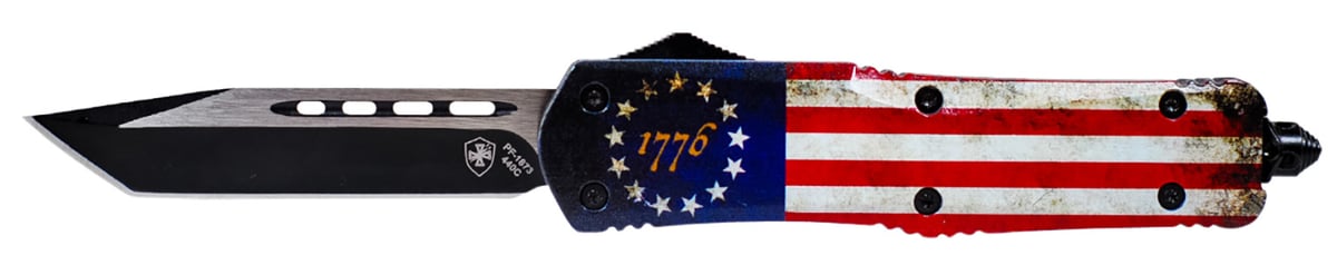 Templar Knife out the front OTF knives feature a double action mechanism that is reliable when you need it. All of our knives also have a builtin safety feature. If the blade meets any resistance before locking out it will stop. So in the event of it opening in your pocket you dont have to worry about the blade being fully deployed. The blade can be reset by pulling it to the locked position. Once this is done the knife is back in operation. Features a glass breaker and pocket clip. Each Knife includes a black box and a nylon sheath. Handle is the Betsy Ross Flag in Zinc Aluminum Alloy..