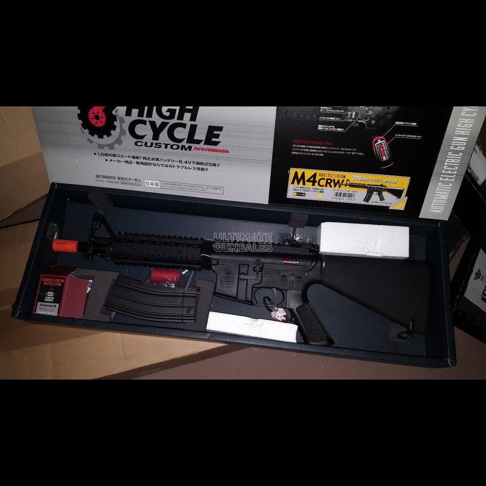 Tokyo Marui M4 CRW High Cycle Custom Airsoft AEG Features: Made in Japan by Tokyo Marui, ASGK Certified Full metal RIS, polymer Colt body, solid replica EG30000 Extreme Cycle Motor installed Capable of over 40 RPS with an 11.1v Lipo We recommend a 9.6v NIMH or 7.4v Lipo battery for optimum reliability