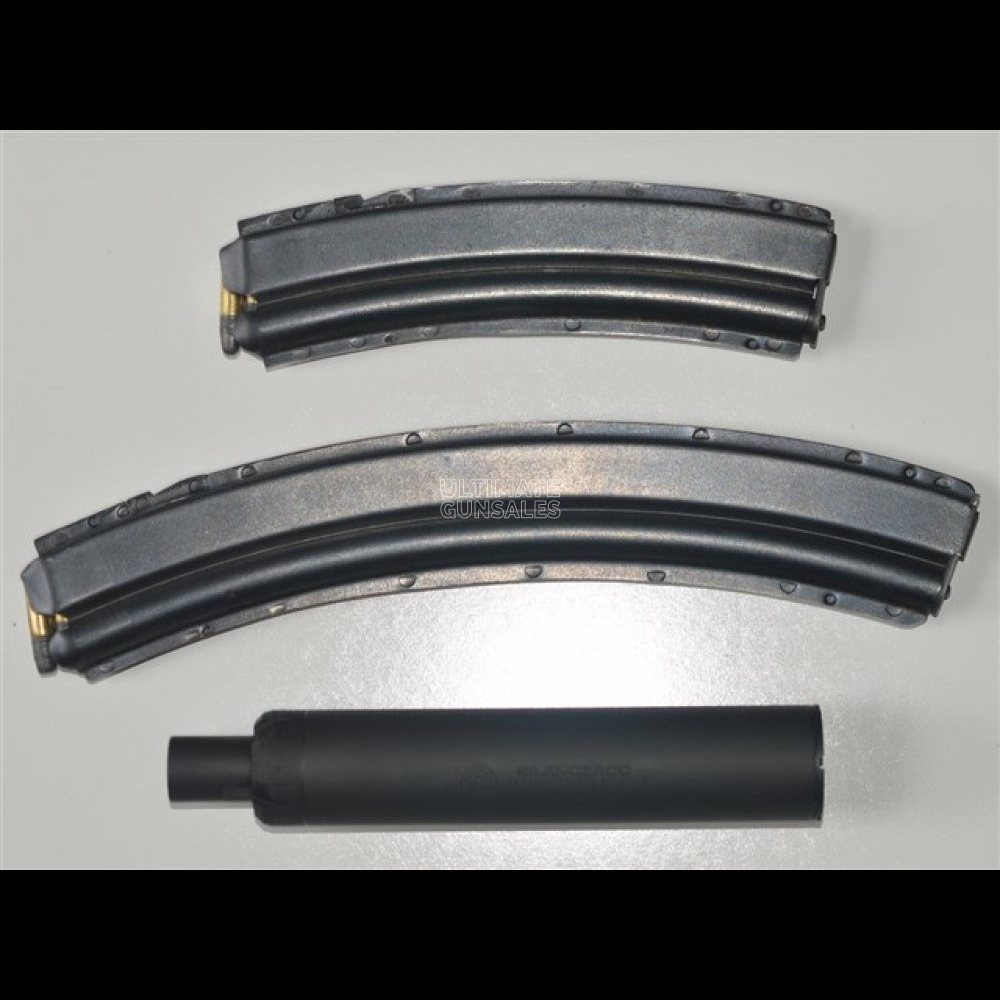 Made in Italy by Armi Jager in .22 LR using the AP-80 action and imported by Bingham, Ltd., Atlanta, GA, it was converted to full automatic by Hard Times Armory of Smyrna, Georgia. Round 18″ barrel fitted with a cleaning rod and threaded muzzle; post front sight and adjustable rear sight. Receiver stamped below ejector port “ARMI JAGER ITALY – MOD AP80 – CAL 22LR Comes with one 30-round and one 15-round magazine. Additional magazines available. Silencerco Sparrow .22 cal. suppressor with threaded muzzle adapter. Excellent condition as converted, with 99%+ of the blue finish, showing minor handling marks. Stock is excellent, with a few small pressure dents. Mechanically excellent. This machine gun is an affordable shooter and an excellent training gun, especially for women and young people due to its light weight and minimal recoil