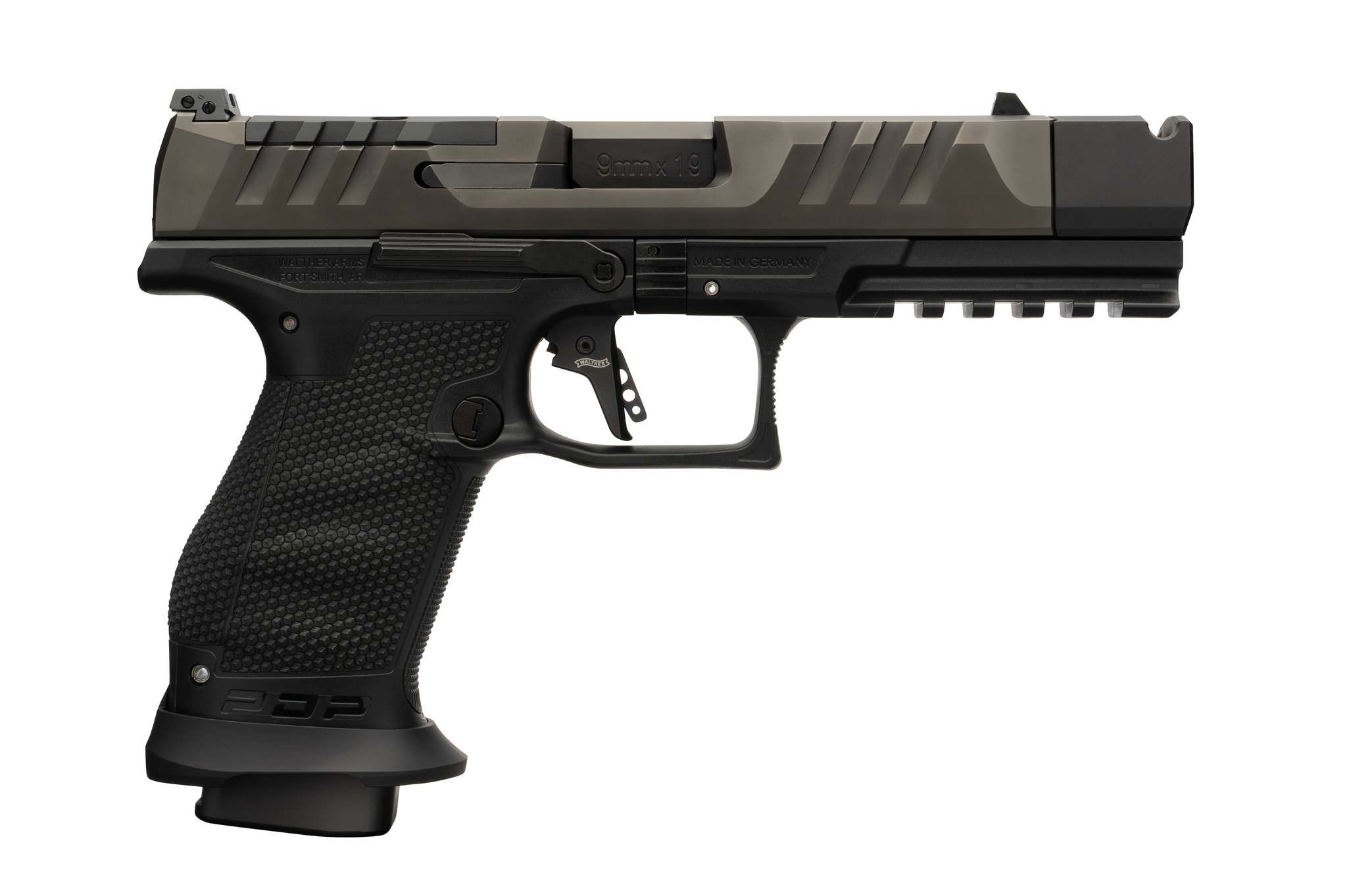 The WALTHER PDP PRO-X PMM COMPACT features a 4-inch slide on a 5″ frame and threaded barrel, seamlessly paired with a Parker Mountain Machine compensator. The PMM compensator is specifically engineered for the PDP, delivering best-in-class recoil reduction while seamlessly blending with the pistol’s aesthetics. This model comes in an all-black finish and includes an optic mount for adapter plates. Three 10 round magazines and a hard case are also included.